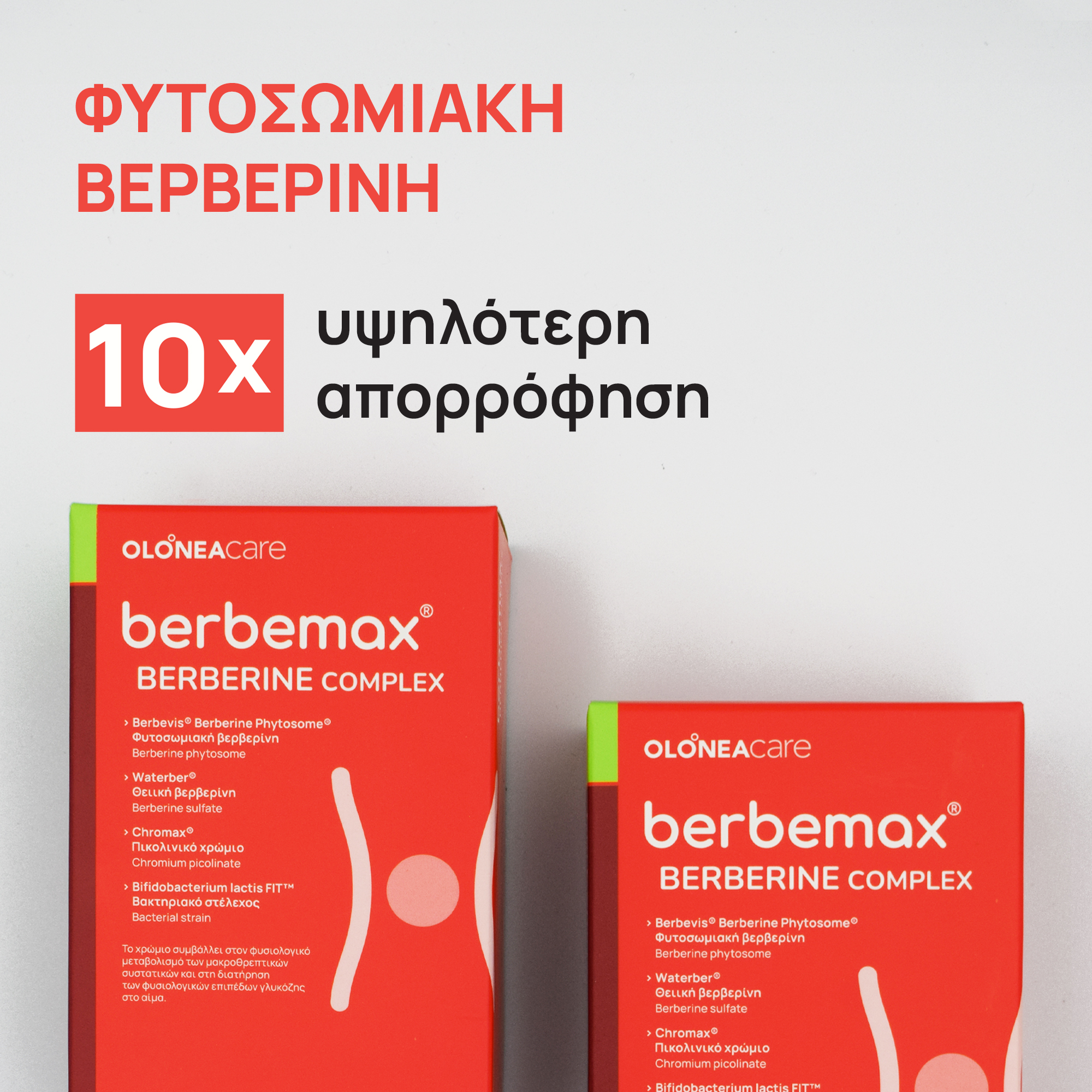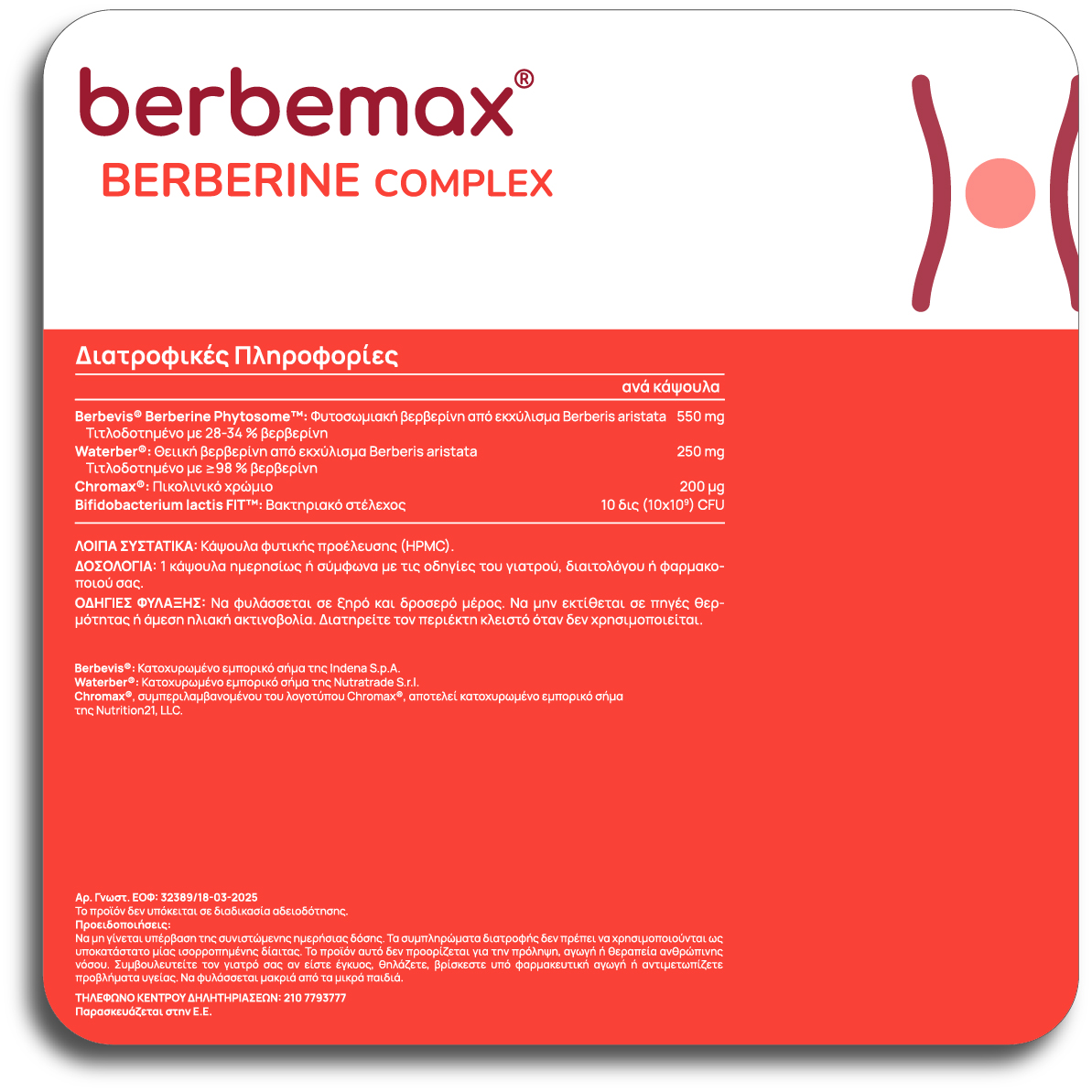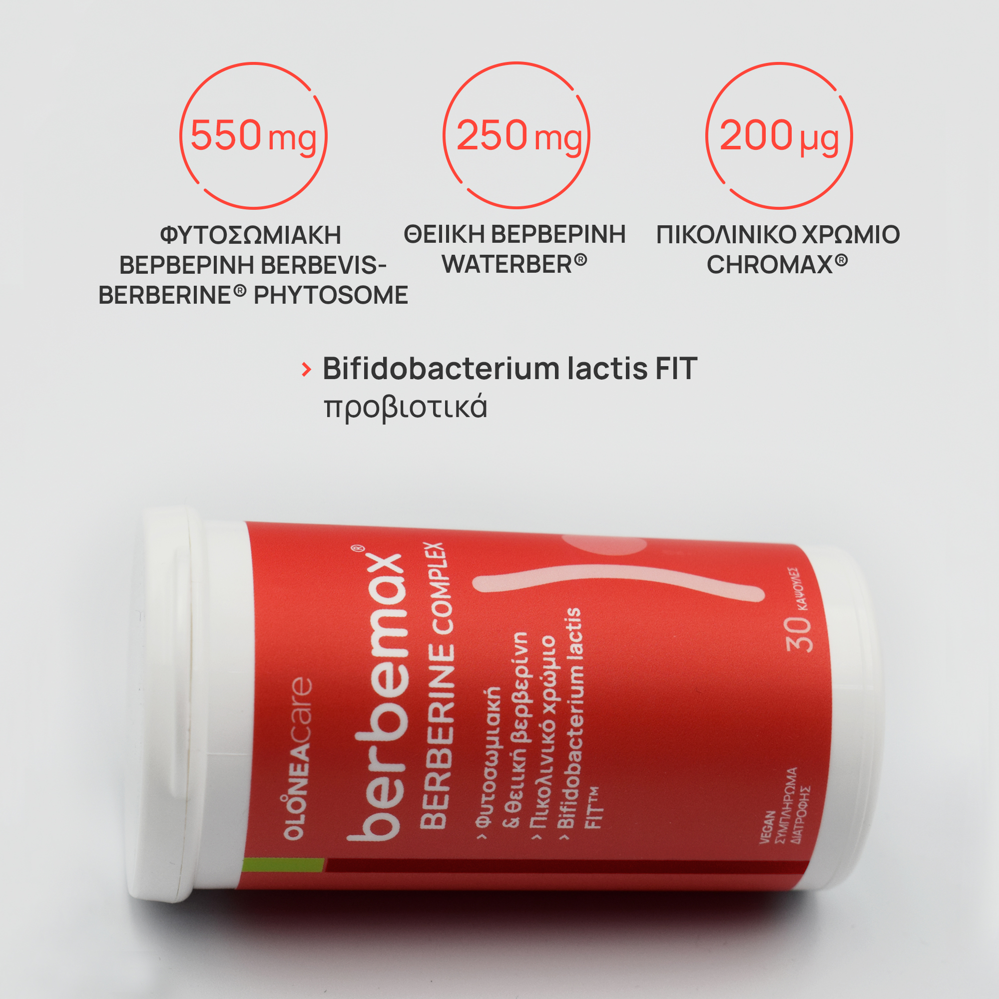 Συμπλήρωμα διατροφής με 2 διαφορετικές μορφές βερβερίνης, φυτοσωμιακή βερβερίνη Berbevis® Phytosome® και θειική βερβερίνη Waterber®, πικολινικό χρώμιο Chromax® και το πατενταρισμένο προβιοτικό στέλεχος Bifidobacterium lactis Fit™