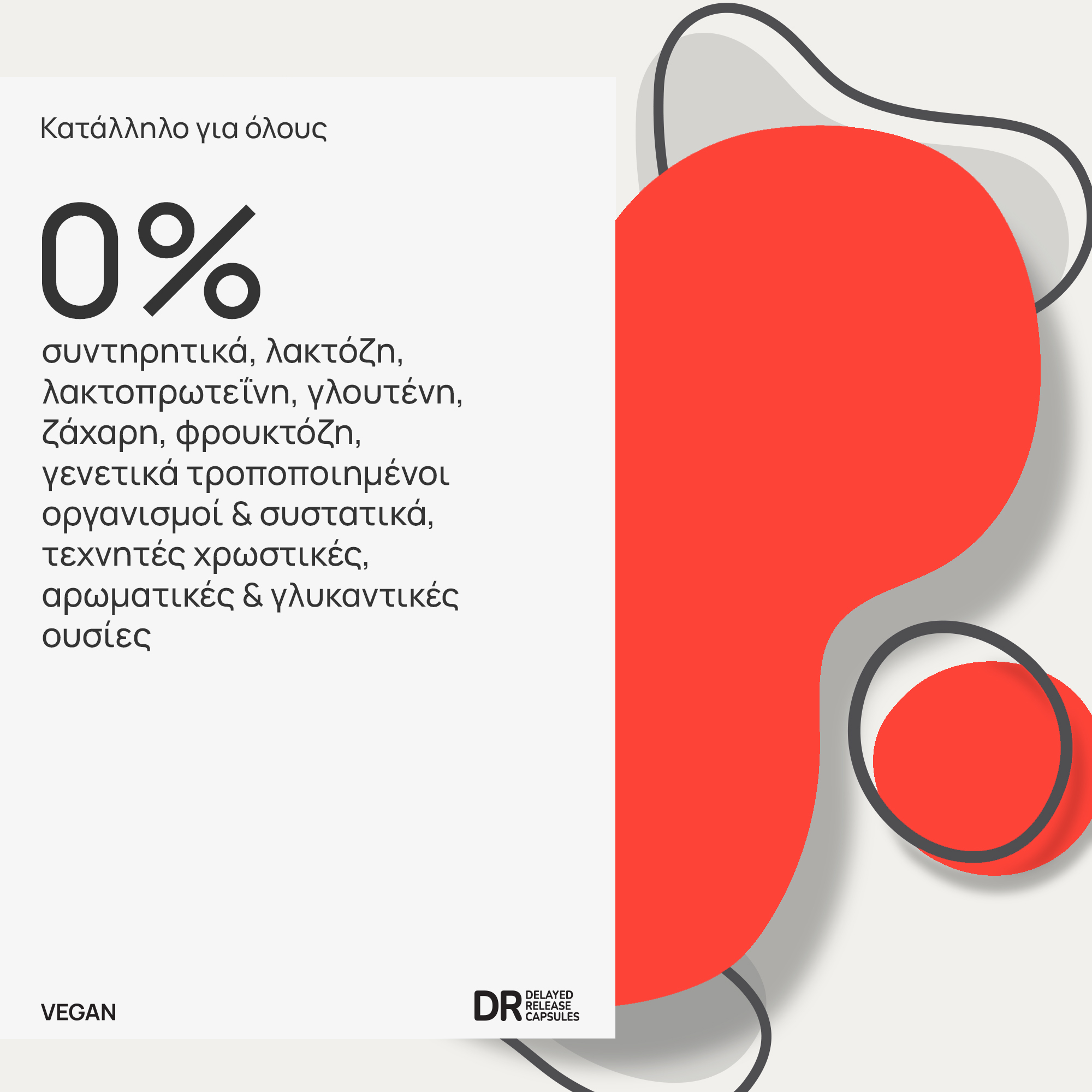 - Χωρίς: συντηρητικά, λακτόζη, λακτοπρωτεΐνη, ζάχαρη, γλουτένη, τεχνητές χρωστικές, αρωματικές και γλυκαντικές ουσίες, γενετικά τροποποιημένους οργανισμούς, βλαπτικά πρόσθετα, ζάχαρη, φρουκτόζη