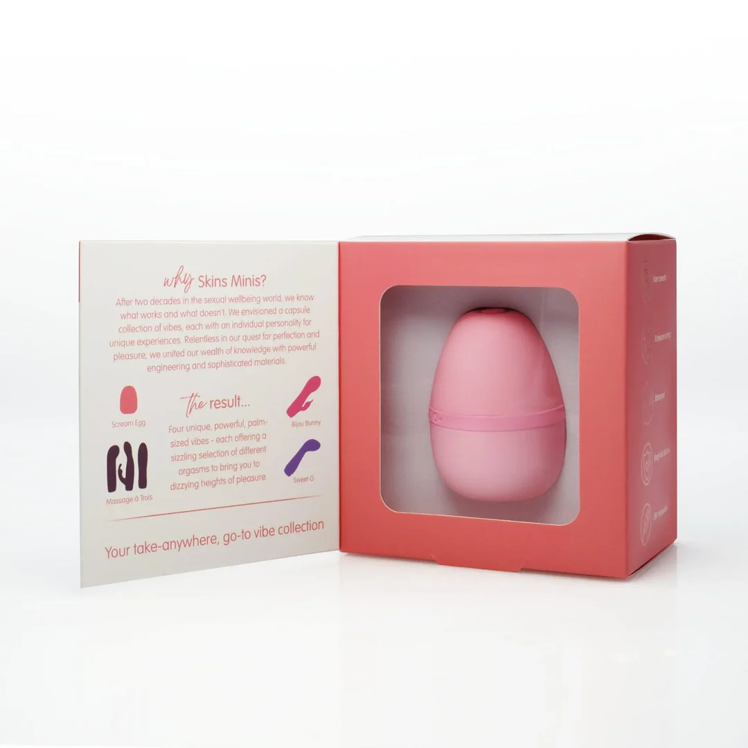 Το Scream Egg από τη σειρά Skins Minis ξεχωρίζει για το μικρό, διακριτικό του μέγεθος και την άνετη εφαρμογή στην παλάμη. Είναι σχεδιασμένο για εξωτερική διέγερση, όπως στην περιοχή της κλειτορίδας ή των θηλών, προσφέροντας ελεγχόμενη και προσαρμόσιμη εμπειρία.