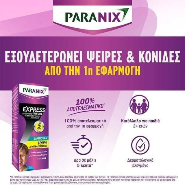 Το Paranix Express Shampoo είναι ένα 100% αποτελεσματικό αντιφθειρικό σαμπουάν, που κλινικά αποδεδειγμένα εξουδετερώνει τις ψείρες σε 5 λεπτά και προστατεύει από πιθανές επαναμολύνσεις. Είναι φιλικό προς το δέρμα του παιδιού σας και πολύ βολικό στη χρήση, καθώς λούζει ταυτόχρονα τα μαλλιά.
