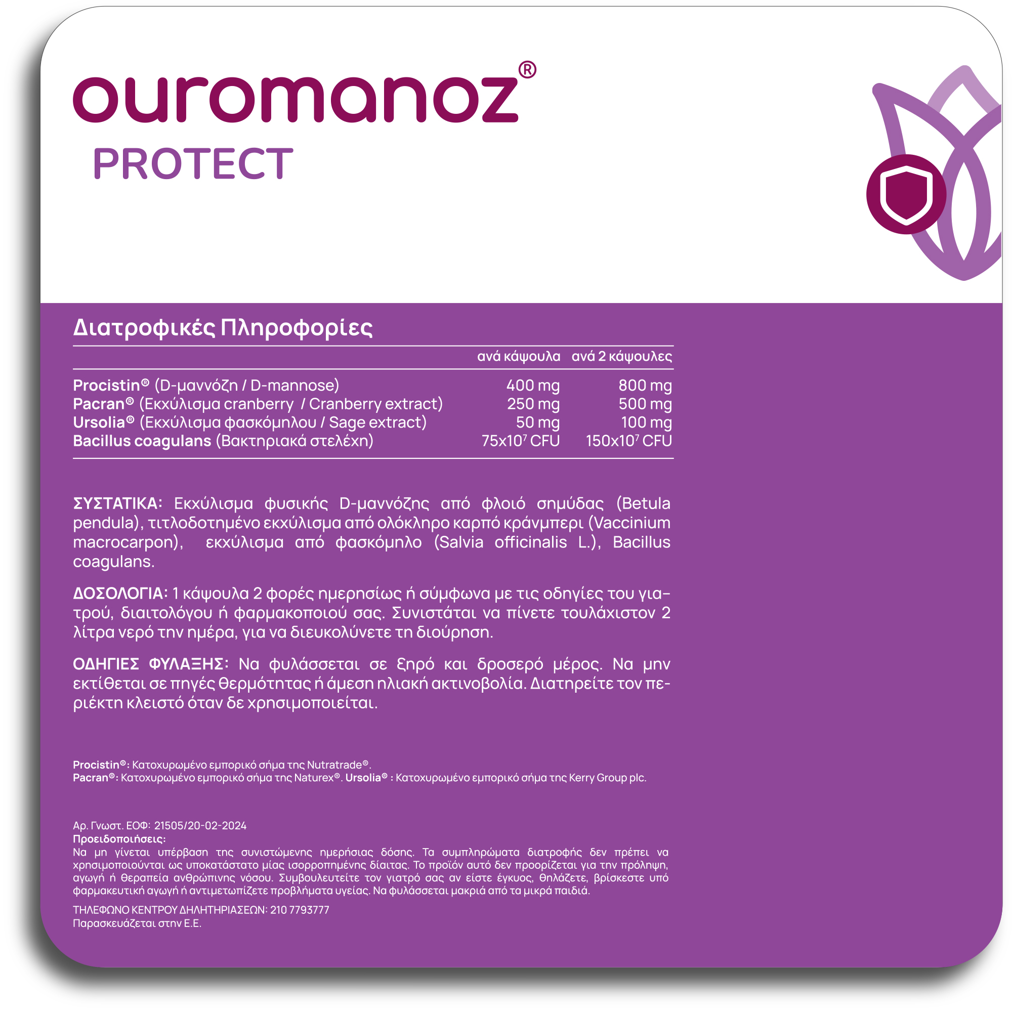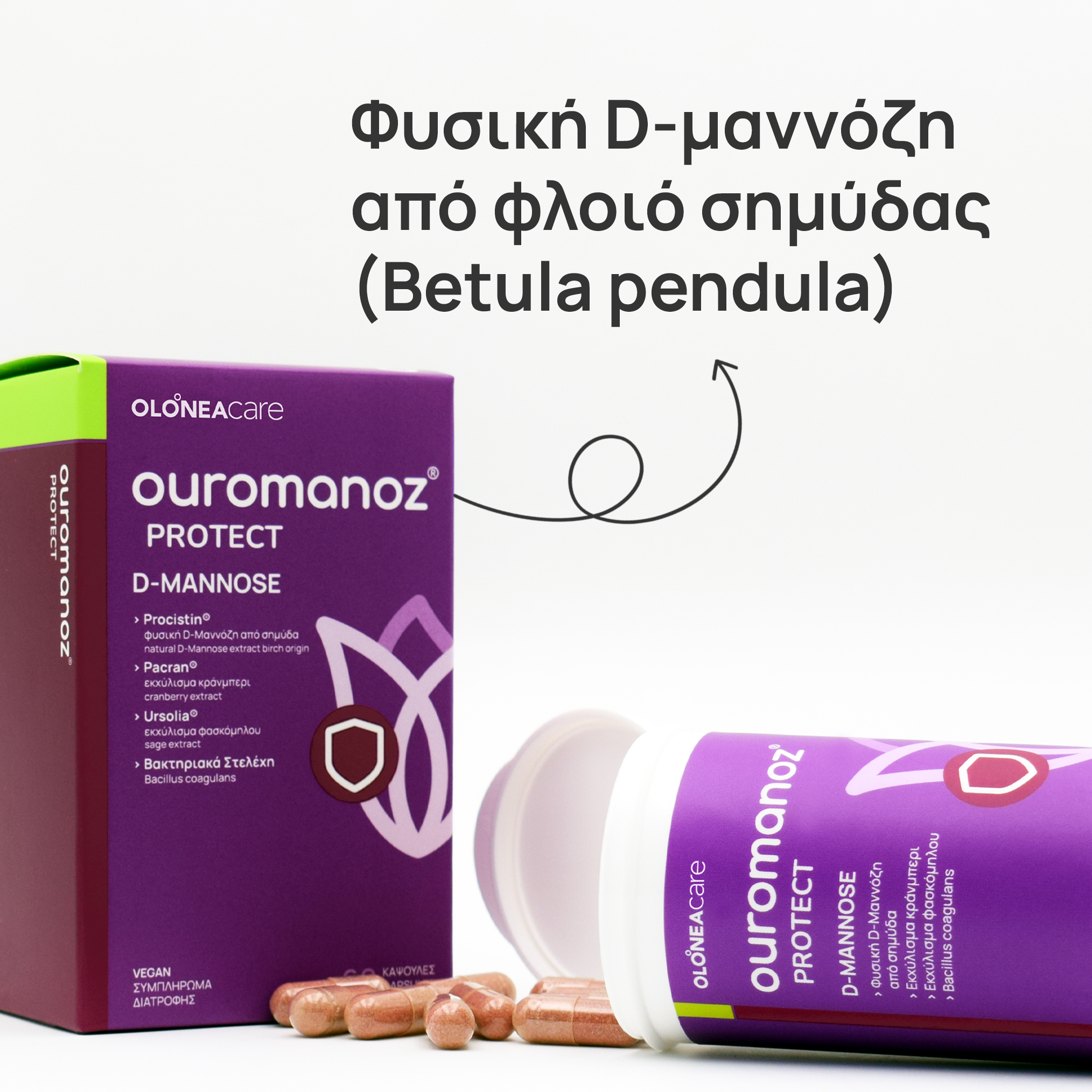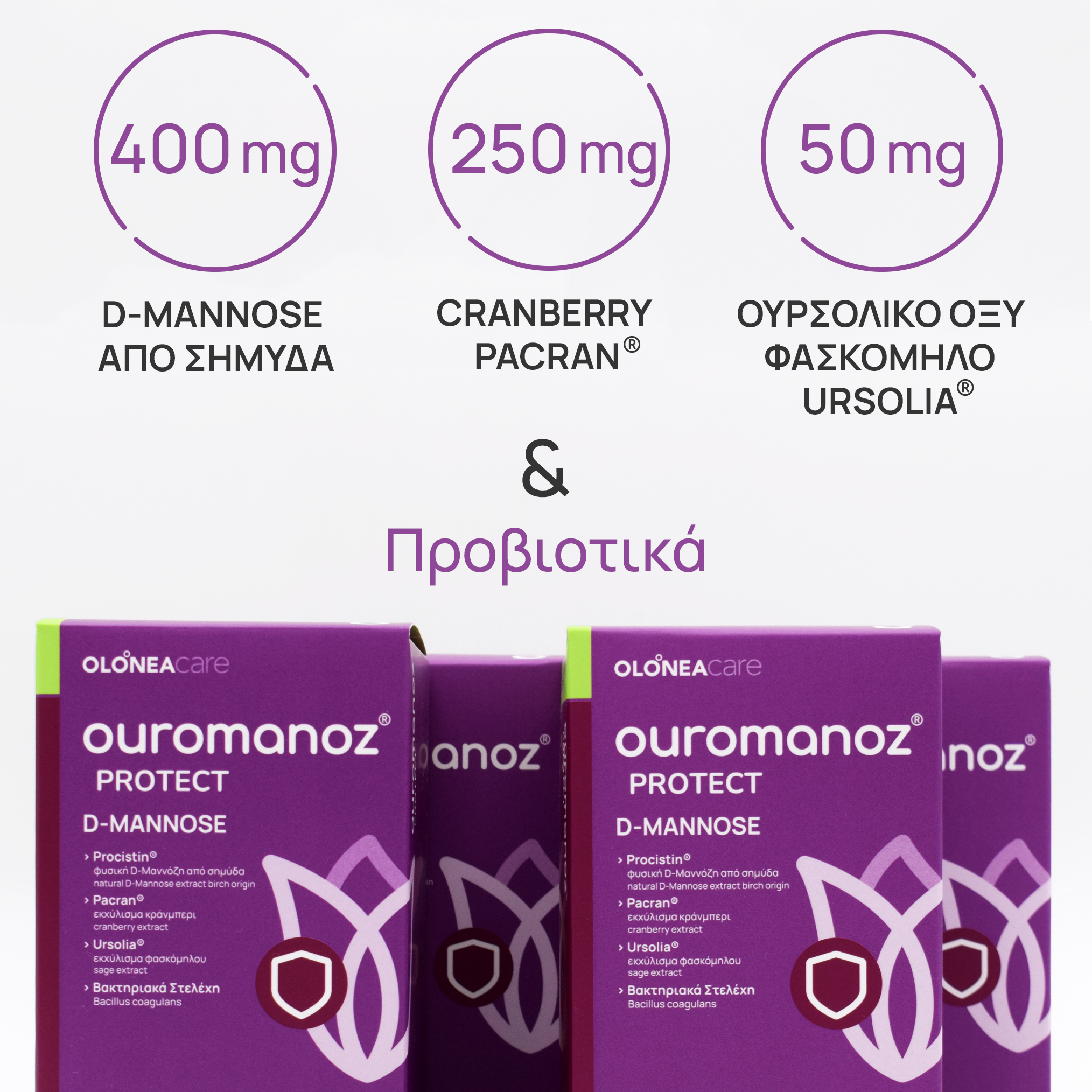 H D-μαννόζη αποτελεί φυσικό δομικό συστατικό του βλεννογόνου της ουροδόχου κύστης. Τα βακτήρια έχουν την ικανότητα να προσκολλώνται εκεί και να προκαλούν φλεγμονή. Όταν η D-μαννόζη λαμβάνεται συμπληρωματικά, δεν διασπάται και φτάνει άθικτη στο ουροποιητικό σύστημα, όπου και αποβάλλεται με την ούρηση. Τα βακτήρια αναγνωρίζουν τη D-μαννόζη και προσκολλώνται πλέον σε αυτή την ελεύθερη μορφή του μονοσακχαρίτη και εν συνεχεία απομακρύνονται μέσω των ούρων. Επιπλέον, βοηθά στην αναδόμηση του κατεστραμμένου βλεννογόνου και εμποδίζει πιθανή νέα ενεργοποίηση βακτηρίων, δρώντας προστατευτικά. Το OUROMANOZ PROTECT διαθέτει φυσική D-μαννόζη από ξηρό εκχύλισμα σημύδας (Betula pendula), χωρίς αλλεργιογόνα και άλλα σάκχαρα.