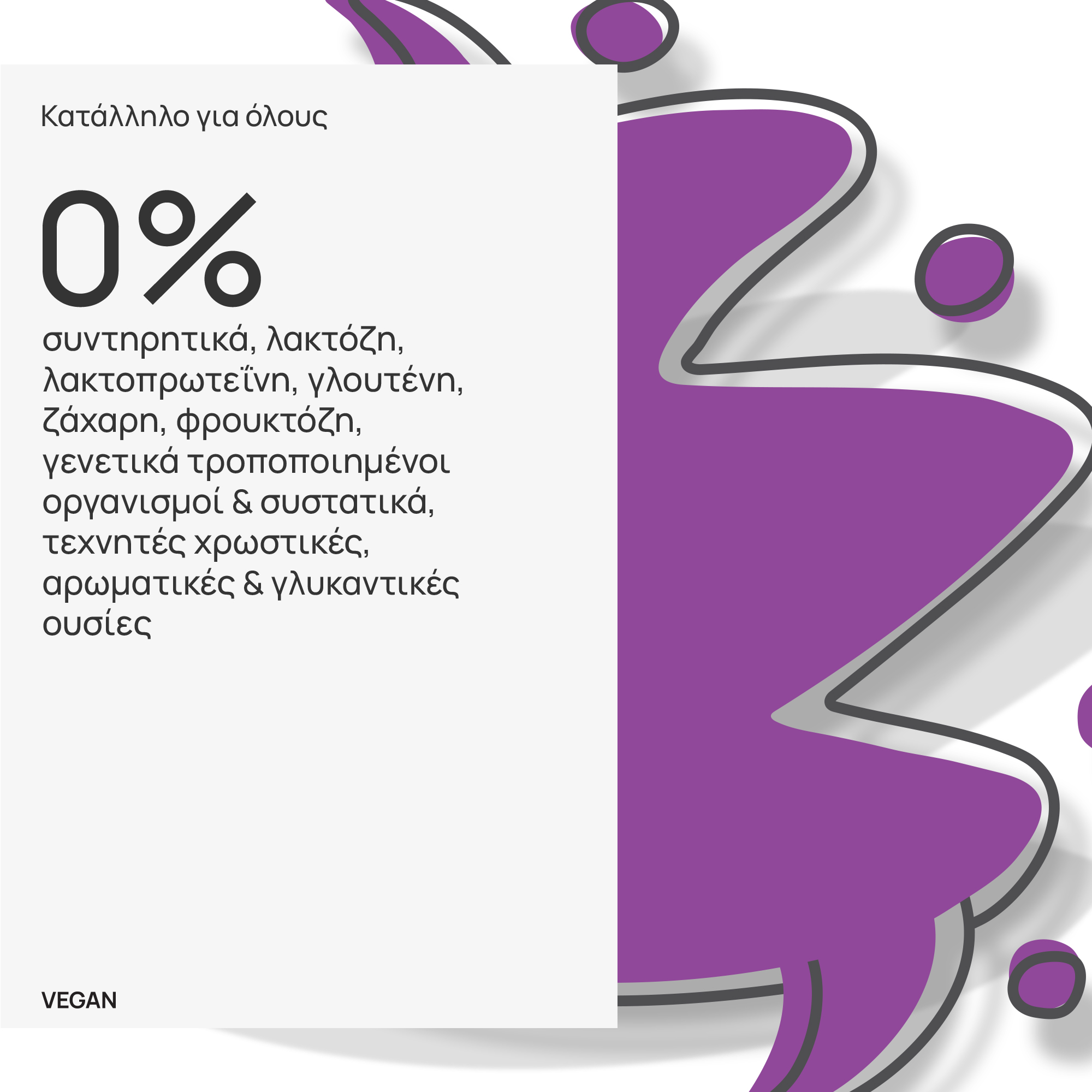 •Χωρίς: συντηρητικά, λακτόζη, λακτοπρωτεΐνη, ζάχαρη, γλουτένη, τεχνητές χρωστικές, αρωματικές και γλυκαντικές ουσίες, γενετικά τροποποιημένους οργανισμούς, βλαπτικά πρόσθετα, ζάχαρη, φρουκτόζη
