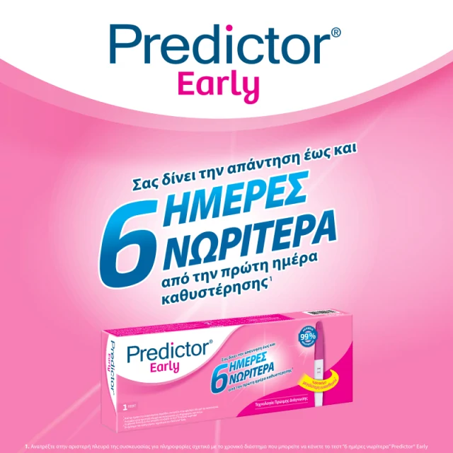 Το Predictor Early τεστ εγκυμοσύνης, με τεχνολογία πρώιμης διάγνωσης, σας απαντά στο ερώτημα ΕΙΜΑΙ ΕΓΚΥΟΣ; έως και 6 ΗΜΕΡΕΣ ΝΩΡΙΤΕΡΑ από την πρώτη ημέρα καθυστέρησης με ακρίβεια μεγαλύτερη από 99%¹.